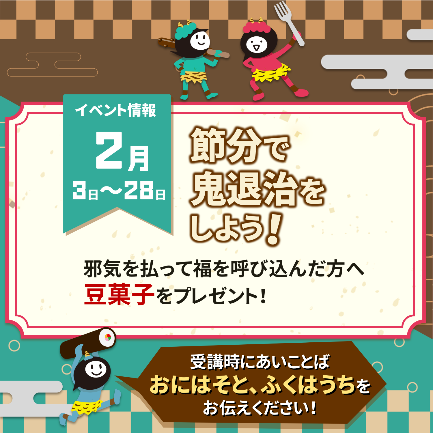 受講時に、スタッフへ合言葉 「おにはそと、ふくはうち」 を伝えてくださいね♪